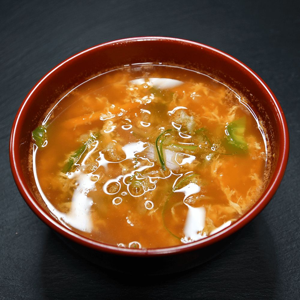 Bouillon épicé au Gochujang avec carottes, poivron, oignons, et œuf, préparé par notre chef asiatique, pour une soupe coréenne riche en saveurs.