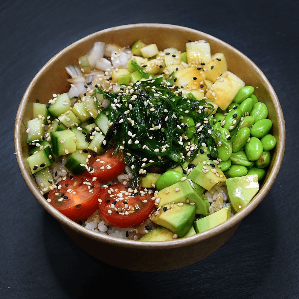 Riz vinaigré, algues wakamé, oignon rouge, avocat, tomates cerises,edamame, pomme Granny, basilic, sésame